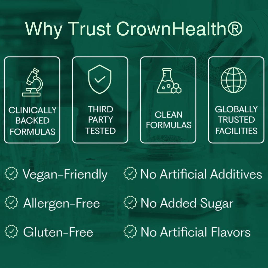 Yes. All Crownhealth® products are vegan-friendly, gluten-free, dairy-free, and made without sugar, soy, or artificial additives.